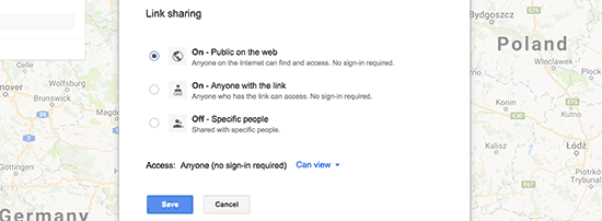 In one case you are done editing your map, you need to make it public then that yous can use it on your website. You tin exercise this past clicking on the share button in the edit panel.
